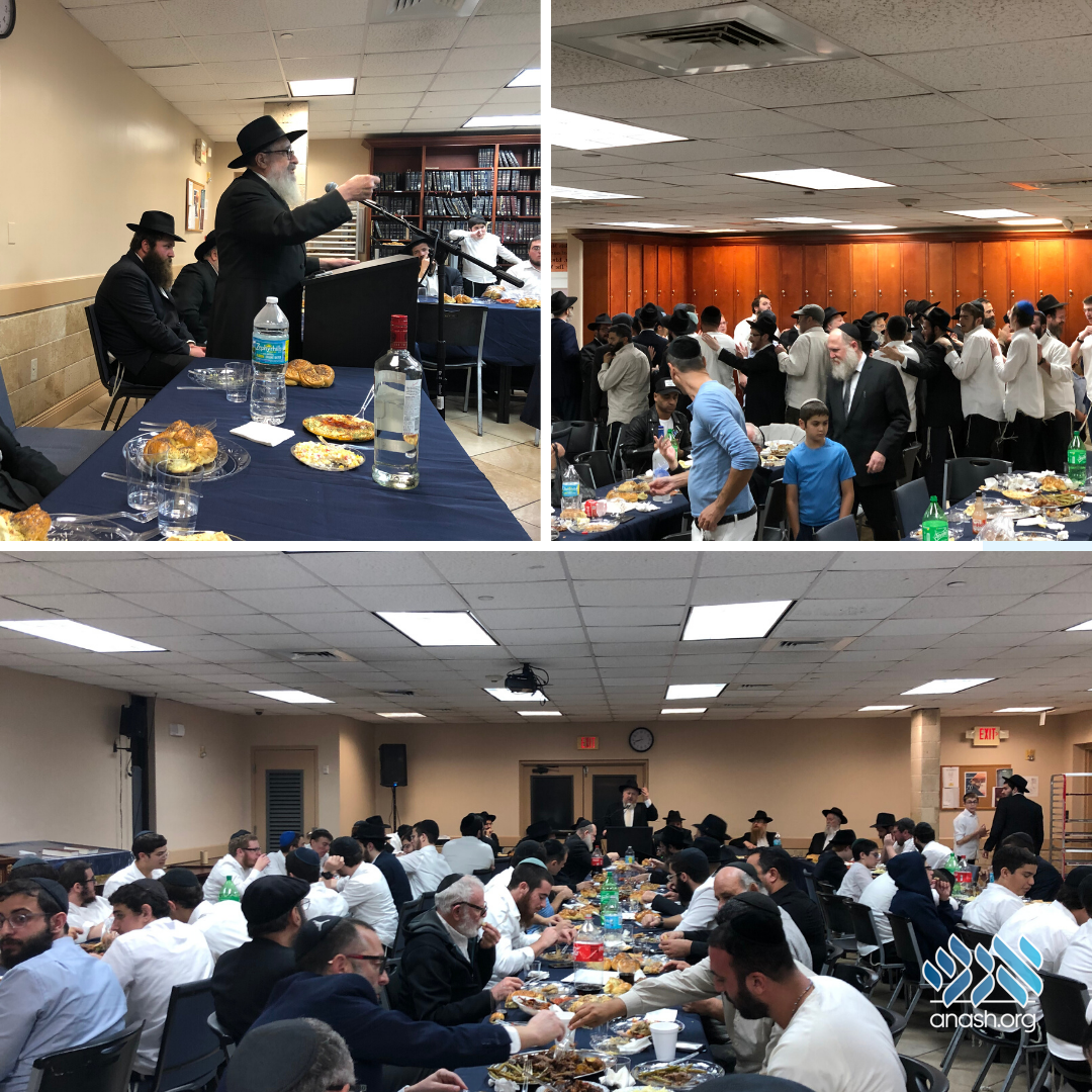 After the formal Yom Tov Seudah, the crowd sat down to farbreng until the early hours of the morning, with Rabbi Mendel Krasjansky, Magid Shiur and Mashpia of Yeshiva, and Menahel Rabbi Chaim Stern.