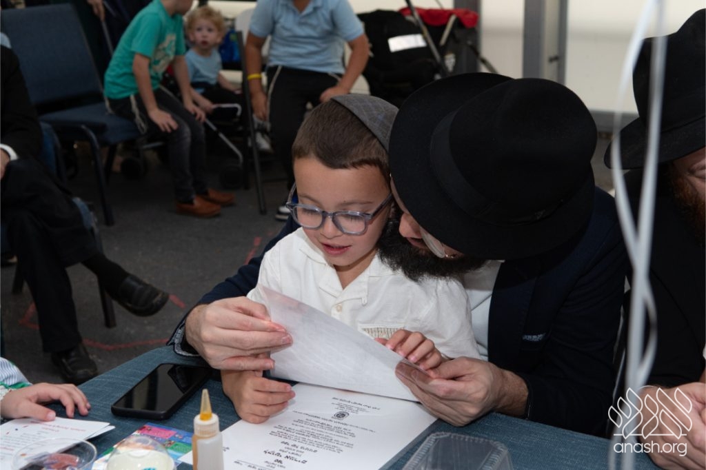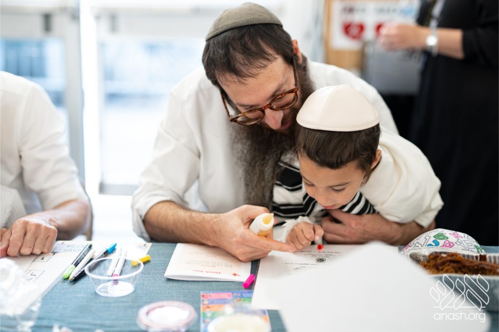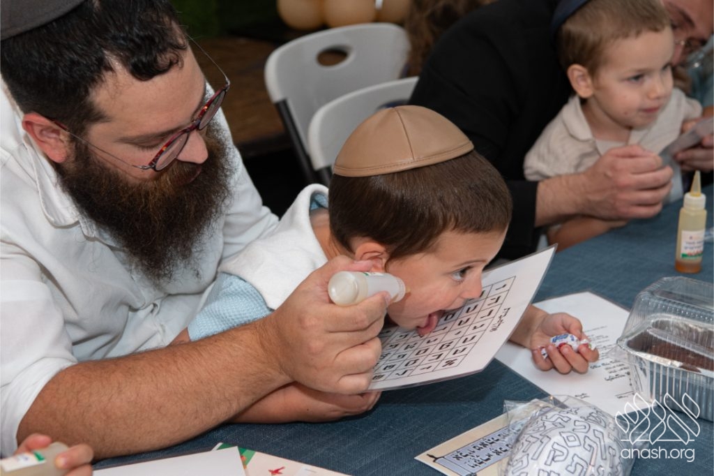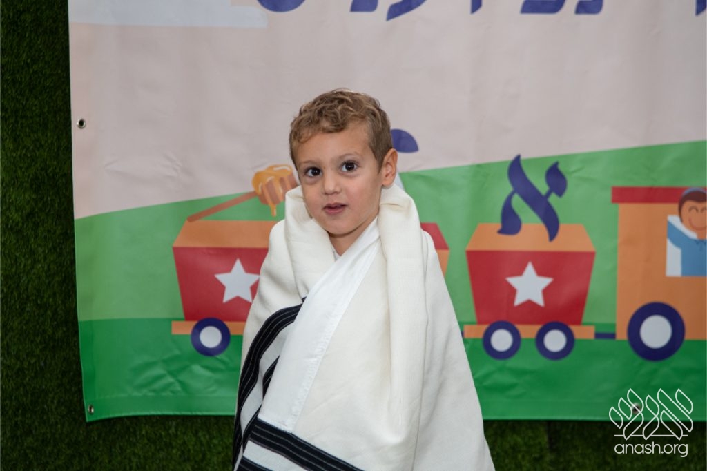 Each child had been joyfully carried in, wrapped in their father’s tallis. Each place around the table had been set with all the traditional items to be used in the ceremony: an egg with a possuk stamped on it, honey cake engraved with another possuk, the sha’ar blatt of Tanya on which the children pointed out the letter Alef, and even a yarmulka to decorate and keep them entertained during transitions. “They thought of everything!” says Mrs. Wolff.