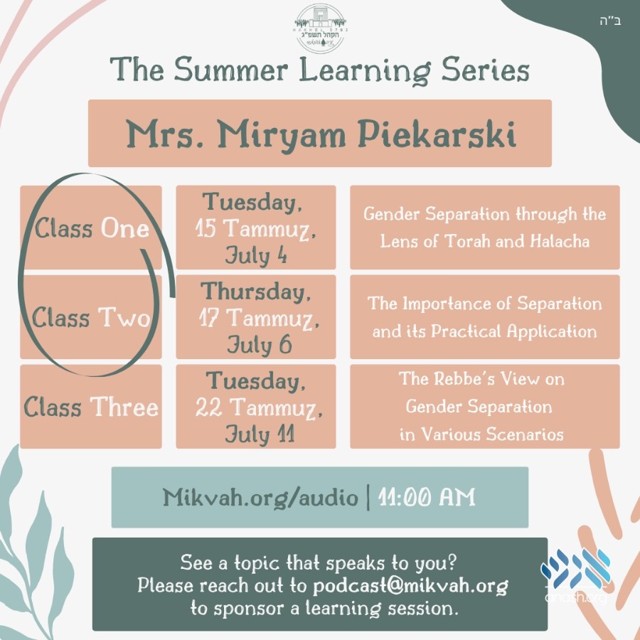 Mikvah.org will be holding a summer learning series, with in-person classes and podcasts. This week’s sessions will present the Rebbe’s views on boundaries between genders with Mrs. Miryam Piekarski.