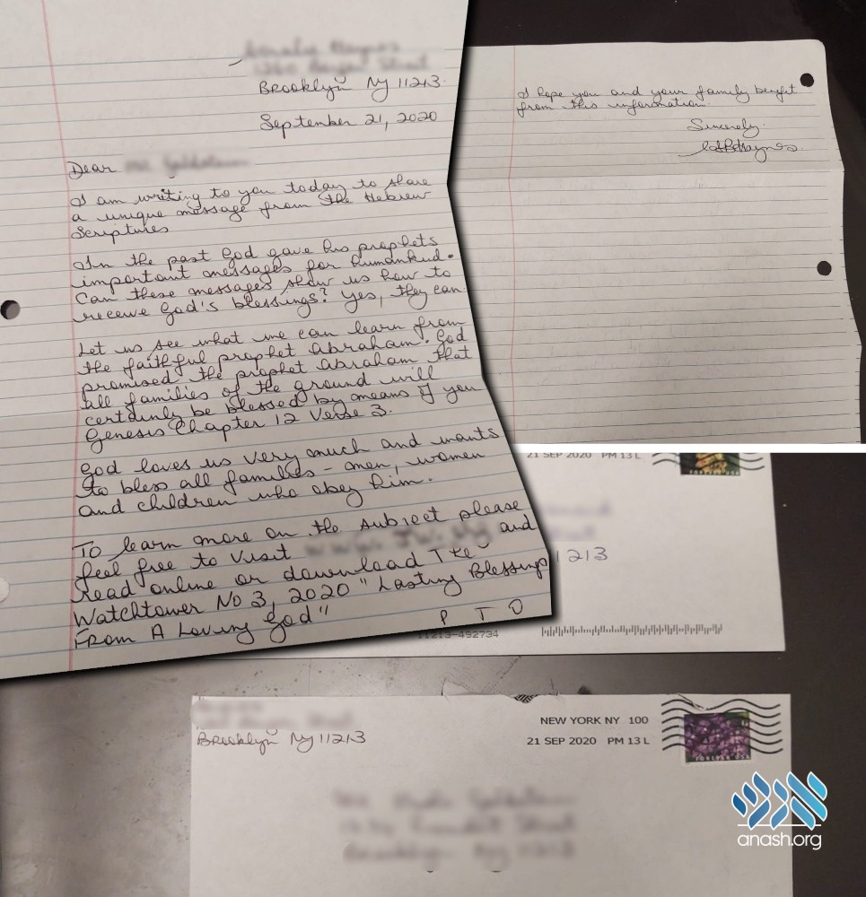 “I actually received two letters, one addressed to me, and one addressed to a previous resident at this address,” the individual who received the letter told Anash.org. “It seems like they are making a concentrated effort to reach Jews in Crown Heights.”