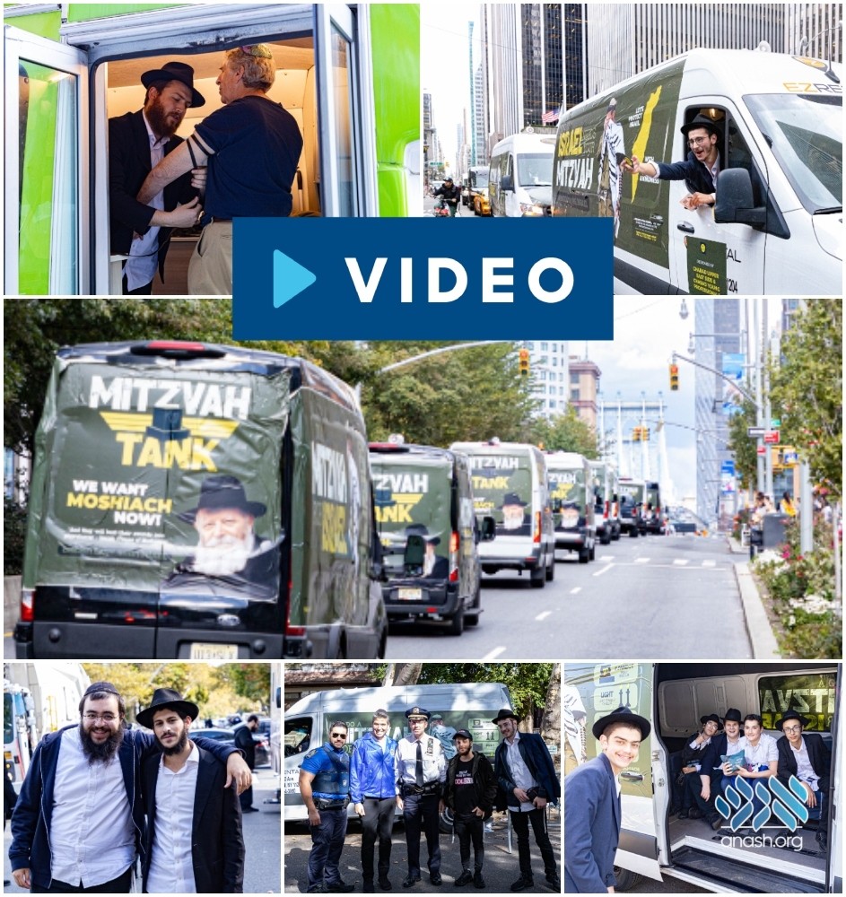 As part of a larger campaign to spread good deeds and add prayers for Israel, a convoy of fifteen mitzvah tanks spread out over NYC laying tefillin and giving tzedakah with Jews across the boroughs.