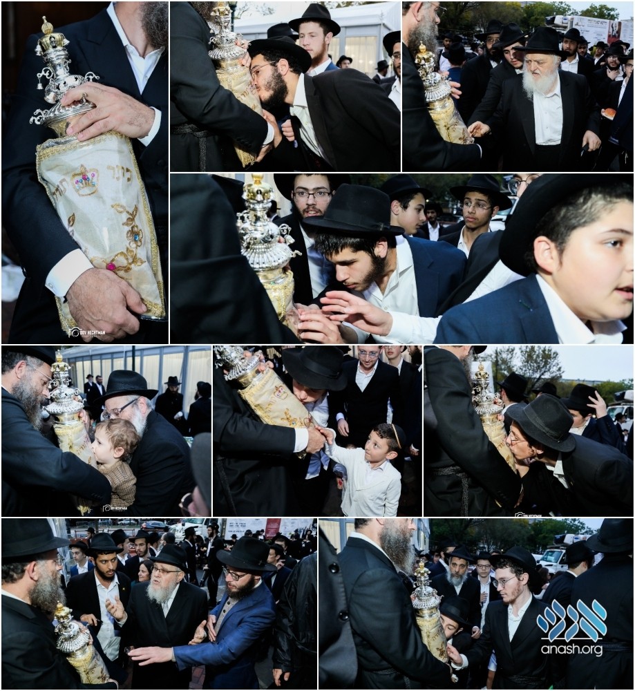 In the minutes before the Yom Tov of Shemini Atzeres began, the small Sefer Torah known as the ‘Rebbe’s Torah’ was brought outside of 770, and hundreds grabbed the opportunity to kiss it.