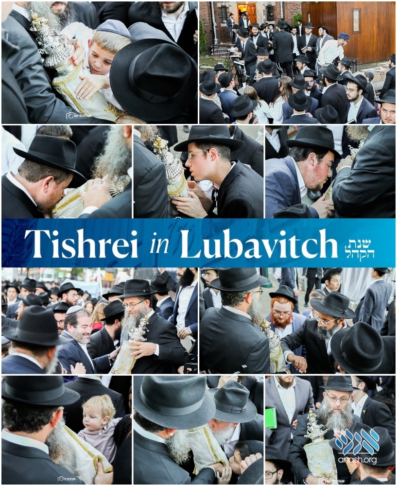 In the minutes before the Yom Tov of Shemini Atzeres began, the small Sefer Torah known as the ‘Rebbe’s Torah’ was brought outside of 770, and hundreds grabbed the opportunity to kiss it.