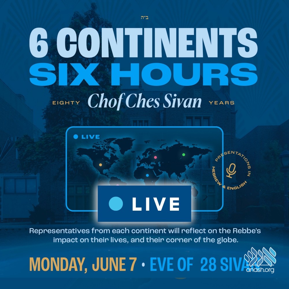 Join Live Monday at 2:30 PM ET: A grand farbrengen marking 80 years since Chof Ches Sivan will span six continents, highlighting the Rebbe’s impact on each one.