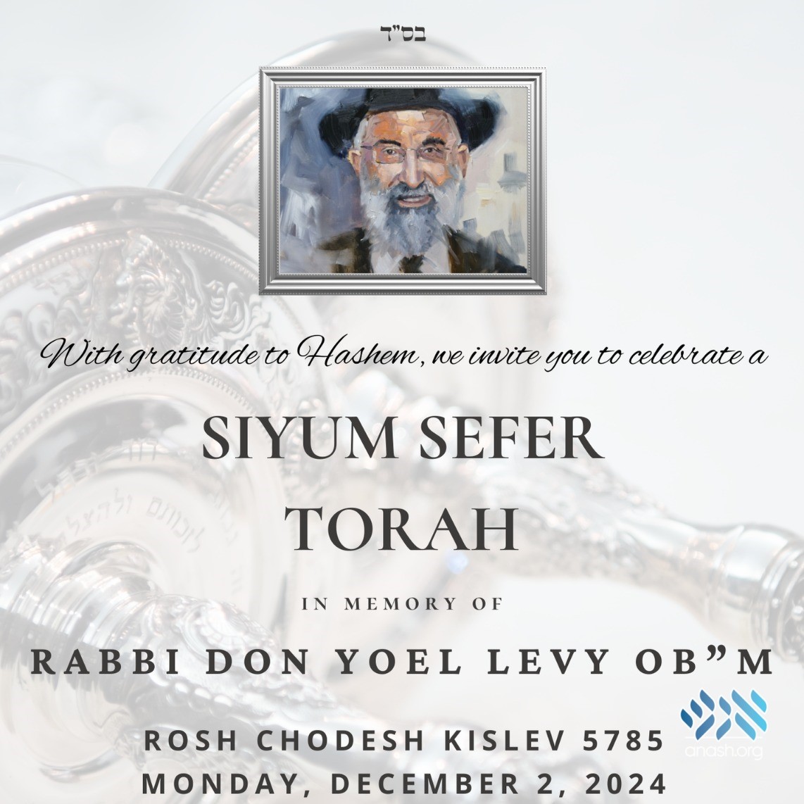 Anash and shluchim are invited to participate in a Siyum Sefer Torah in memory of Rabbi Don Yoel Levy AH, longtime director of OK Kosher and rov of Beis Eliezer Yitzchok shul in Crown Heights.
