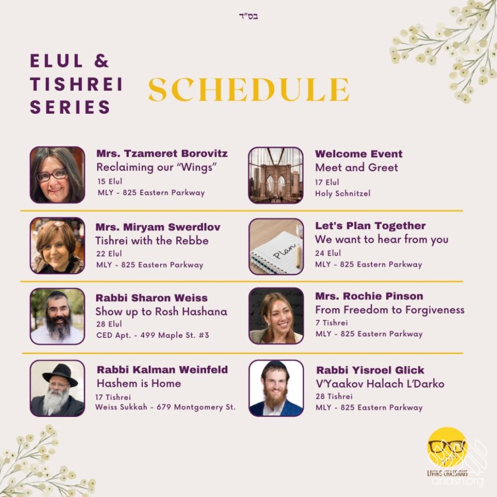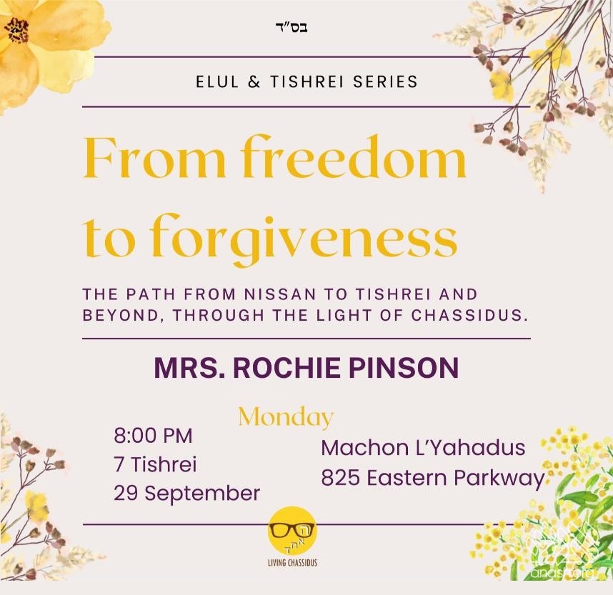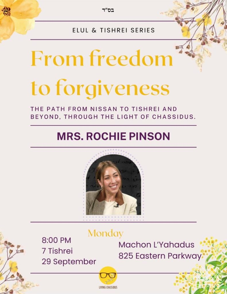 Up next in Living Chassidus’ Elul and Tishrei Series is Mrs. Rochie Pinson, who will be sharing her wisdom and inspiration to get us all in the mindset of Teshuva, connecting with Hashem and preparing for Yom Kippur.