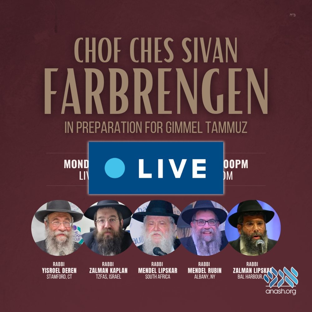 Join live at 4:00 PM ET: A chassidishe farbrengen will be held in honor of Chof Ches Sivan featuring Rabbis Yisroel Deren (Stamford, Connecticut), Zalman Kaplan (Tzfas, Eretz Yisroel), Mendel Lipskar (Johannesburg, South Africa), Rabbi Mendel Rubin (Albany, NY), and Zalman Lipskar (Bal Harbour, Florida).
