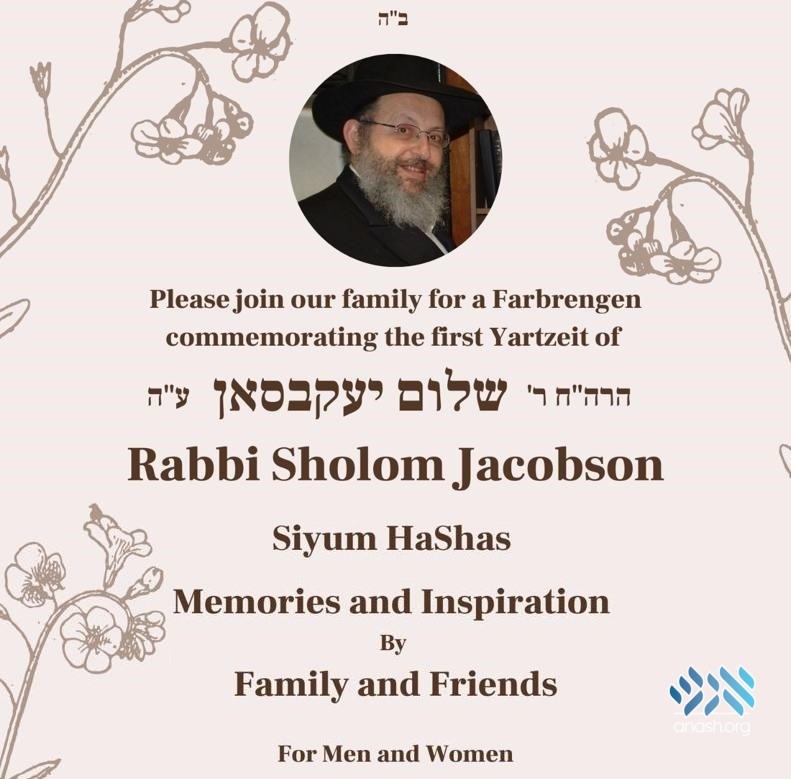Family, friends, and students of Rabbi Sholom Jacobson will gather on Monday, 18 Av, in Crown Heights to mark his first yahrtzeit with a farbrengen and siyum hashas.