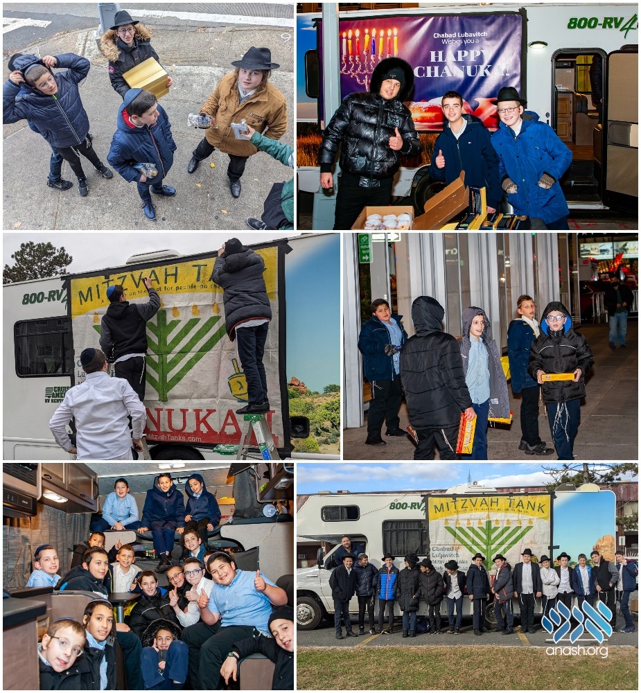 Boys from Lubavitcher schools in Crown Heights and Monsey arranged their own Chanukah mivtzoim, heading out in their own Mitzvah Tanks to bring the light of Chanukah to thousands of Yidden.