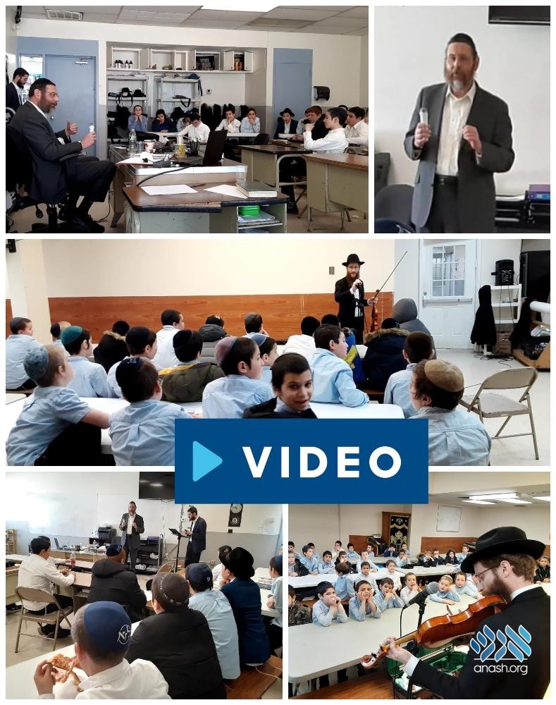 Rabbi Shlomo Segelman, who is a grandchild by the marriage of Rabbi Zalman Jaffe, shared some precious tidbits about the Rebbe and Rebbetzin that circulate in the family. Rabbi Segelman farbrenged for the grades 1-5 and also played several stirring chassidishe melodies on his violin, inspiring the talmidim to sing along and be uplifted.