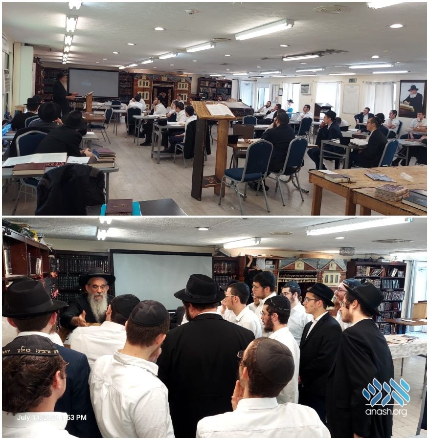 Rov of Anash in Montreal, Harav Berel Bell, visited the Poconos Yeshiva where he delivered a shiur on the proper “derech halimud,” focusing on how a “sugya” develops toward halacha.