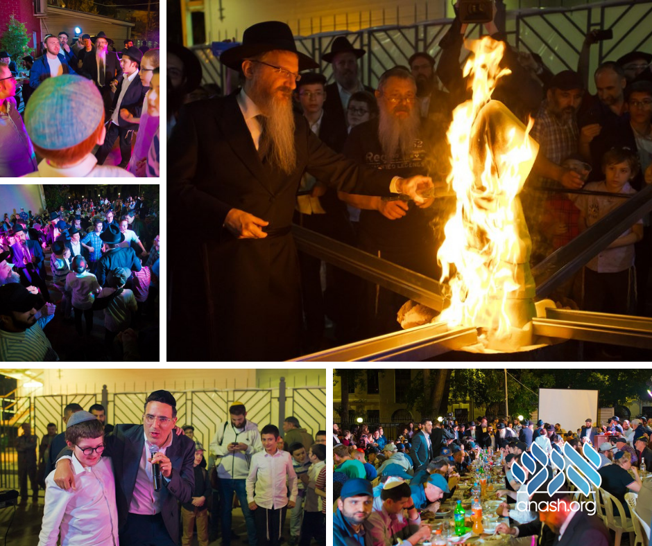 After the lighting and dancing, a grand farbrengen was held in honor of the yomtov, with singer Yaakov Shwekey leading the crowd in special Lag Baomer niggunim.