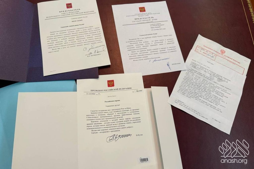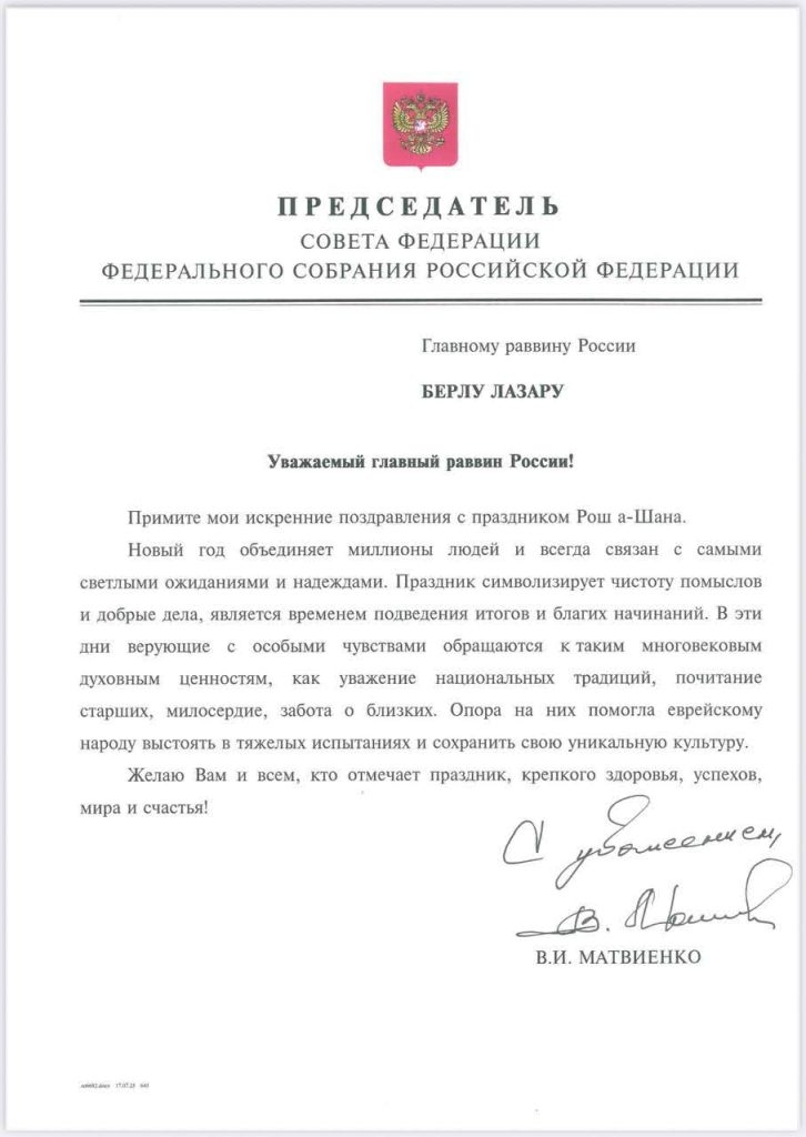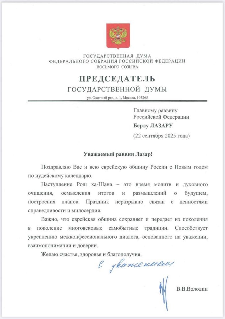 In addition to congratulatory letters sent by the Russian Prime Minister, the Speaker of Parliament, the Speaker of the State Duma, and other heads of state, on the eve of the holiday, the Chief Rabbi’s office also received a congratulatory letter from the Russian President, in which he writes:
