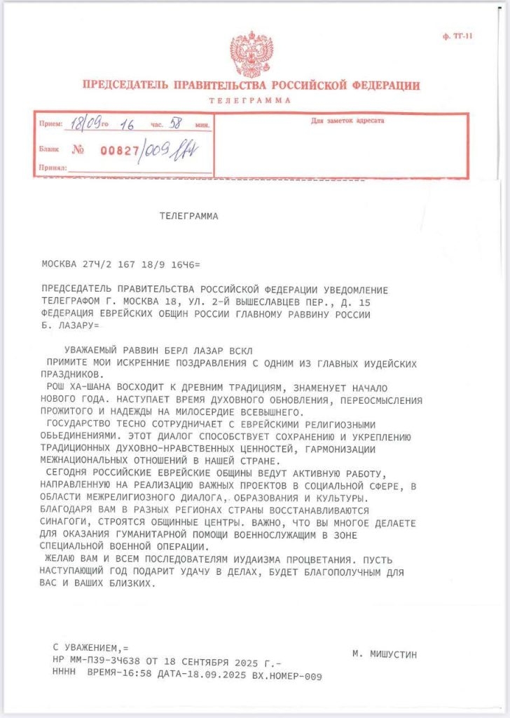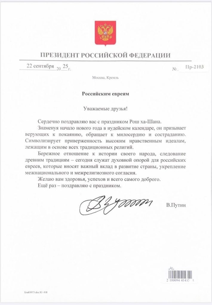 “To the Jews of Russia, distinguished friends! I hereby congratulate you on the holiday of Rosh Hashanah. This holiday, which marks the beginning of the new year on the Jewish calendar, calls upon the faithful to repentance, kindness, and mercy. It symbolizes adherence to high moral visions, which are at the foundation of all traditional religions. Respectful treatment of the people’s history and adherence to the traditions of the ancestors now serve as a spiritual cornerstone for Russian Jews, who make an important contribution to the development of the country, to strengthening ties of friendship and mutual understanding between peoples of different nations and religions. I wish you good health, complete success, and all the best, and once again – many congratulations on the holiday! Vladimir Putin.”
