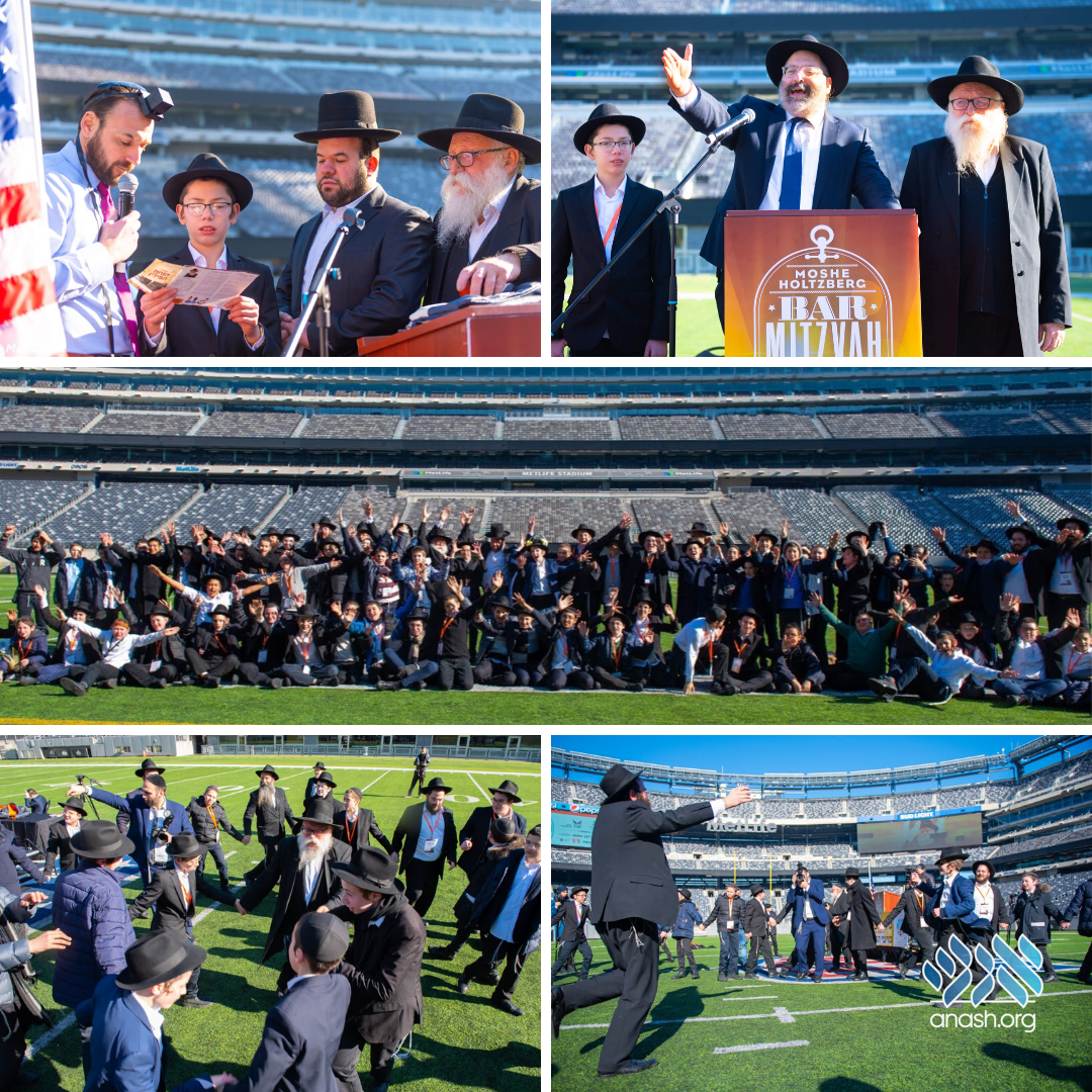 Surrounded by classmates and boys his age, Moishy Holtzberg, surviving son of Gavi and Rivki hy”d got another bar mitzva celebration, this time at the MetLife Stadium in New Jersey.