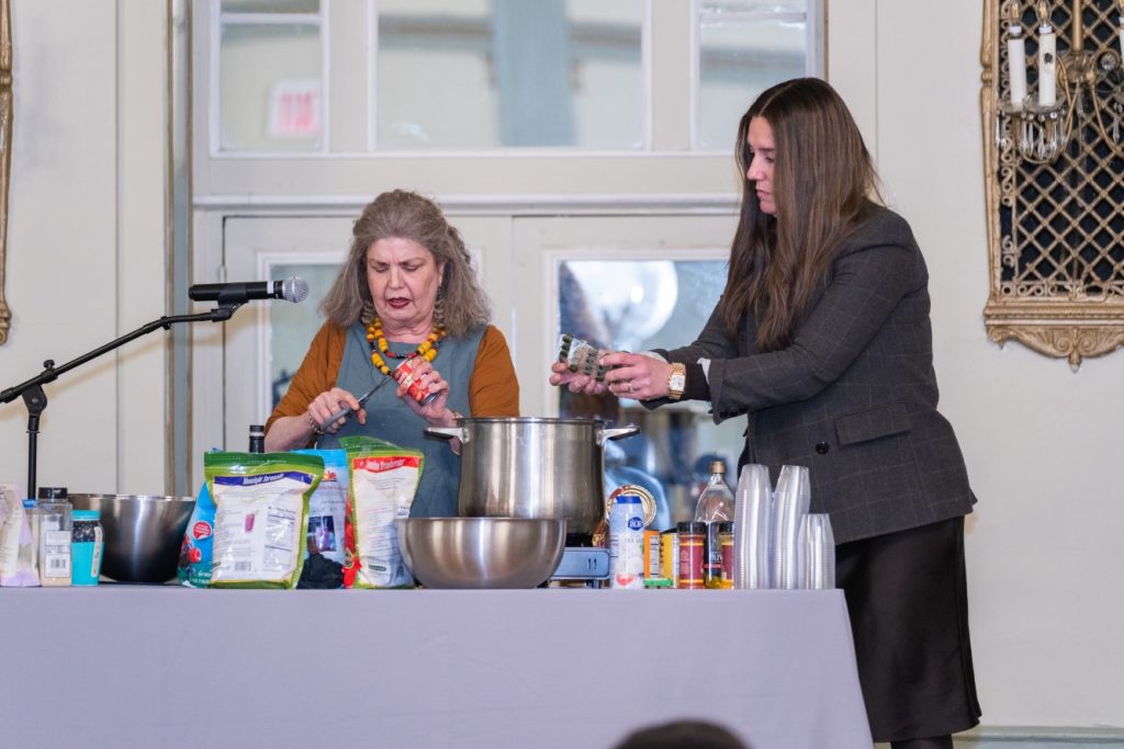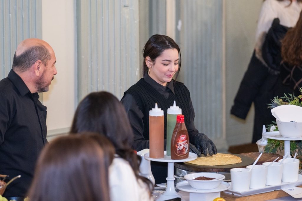 A delicious buffet of fresh fruit, crepes, and refreshing drinks was enjoyed by all. Adding a warm and interactive element to the program, Mrs. Levana Kirschenbaum presented a live cooking demonstration. Women enjoyed tasting the dishes, creating an atmosphere of connection and enjoyment throughout the evening.