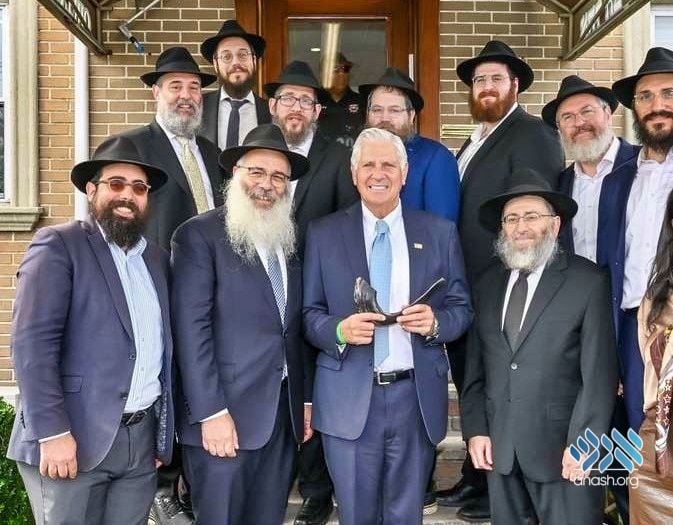 The group of 12 shluchim who accompanied Blakeman from Nassau County was led by the most senior shliach on Long Island, Rabbi Anchelle Perl, who introduced Chabad to the area. Accompanying him were Rabbi Zalman Wolowik, Rabbi Mendy Brownstein, Rabbi Yona Eidelkop, Rabbi Noach Goldschmidt, Rabbi Eli Goodman, Rabbi Mendy Gordon, Rabbi Levi Gurkov, Rabbi Shimon Kramer, Rabbi Yossi Rabl, Rabbi Yossi Lieberman, and Rabbi Nachum Tenenbaum.