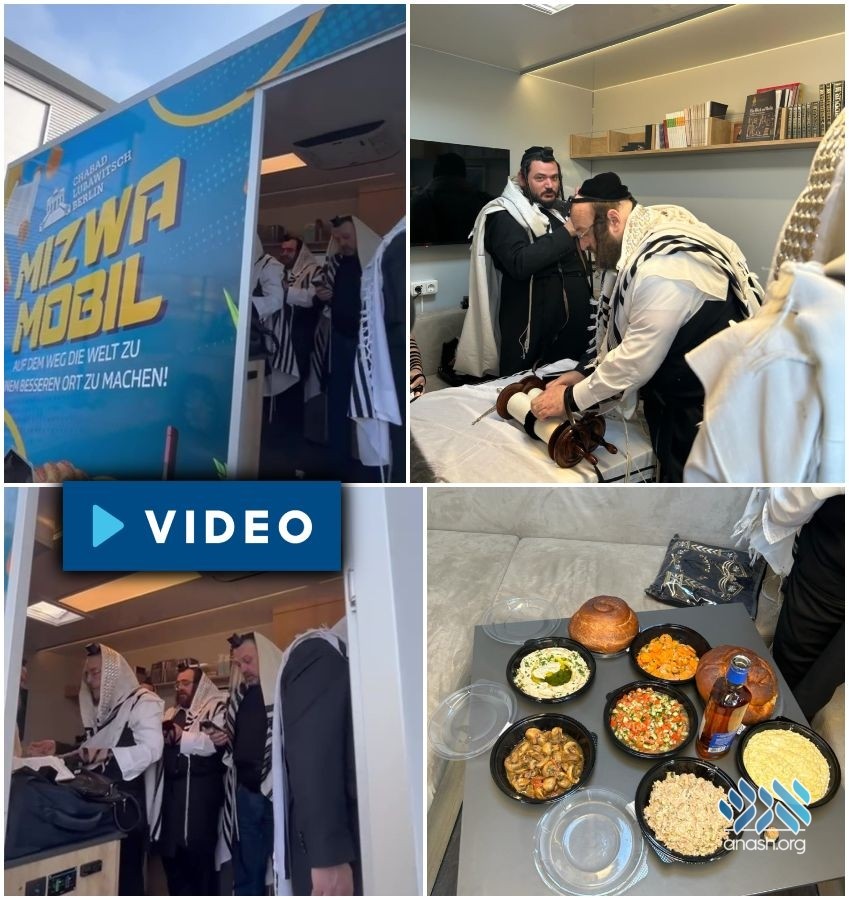 Today, a group of Stamar yungeleit landed in Berlin airport for a short stopover on their way to visit kivrei tzadikim. Seeking a minyan and sefer Torah, they reached out to Rabbi Yehuda Teichtal of Chabad of Berlin. Rabbi Teichtal sent them a Mitzva Tank with a sefer Torah and fresh kosher food.