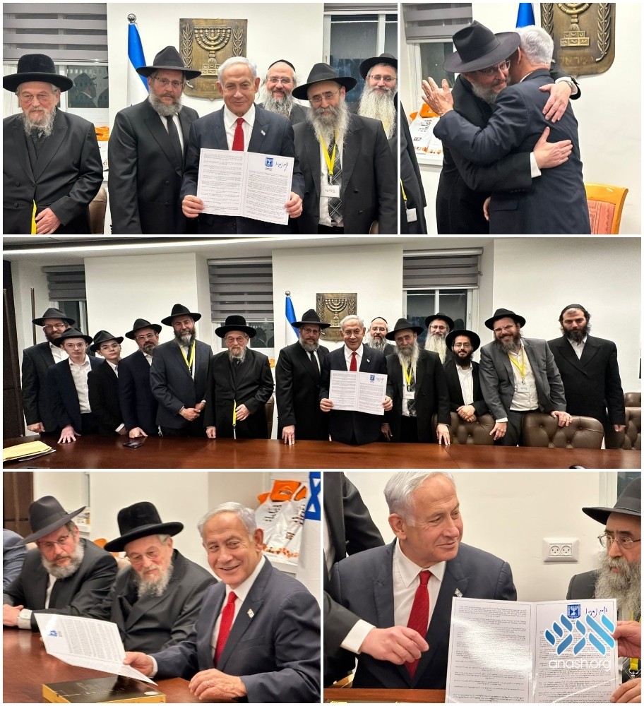 Netanyahu signed the declaration in the presence of an official Chabad delegation, led by Harav Yitzchak Yehuda Yaroslavsky – av beis din of the Beis Din Rabbonei Chabad in Eretz Yisroel, members of the Beis Din Rabbi Menachem Mendel Gluckowsky and Rabbi Avraham Michael Halperin, and Rabbi Yosef Yitzchak Aharonov, chairman of Tzach, along with representatives of the empire of Chabad shluchim in Eretz Yisroel.