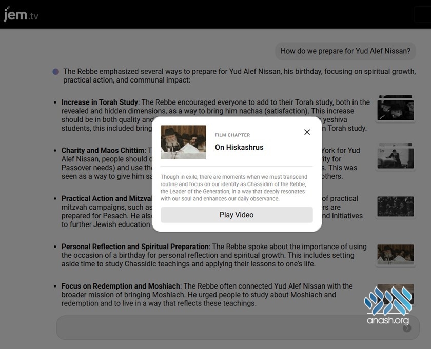 For decades, Jewish Educational Media (JEM) has meticulously curated, translated, and produced thousands of videos capturing the Rebbe’s teachings and personal interactions. Soon, JEM will be rolling out a groundbreaking AI-powered tool that will transform how users access and explore this vast archive.