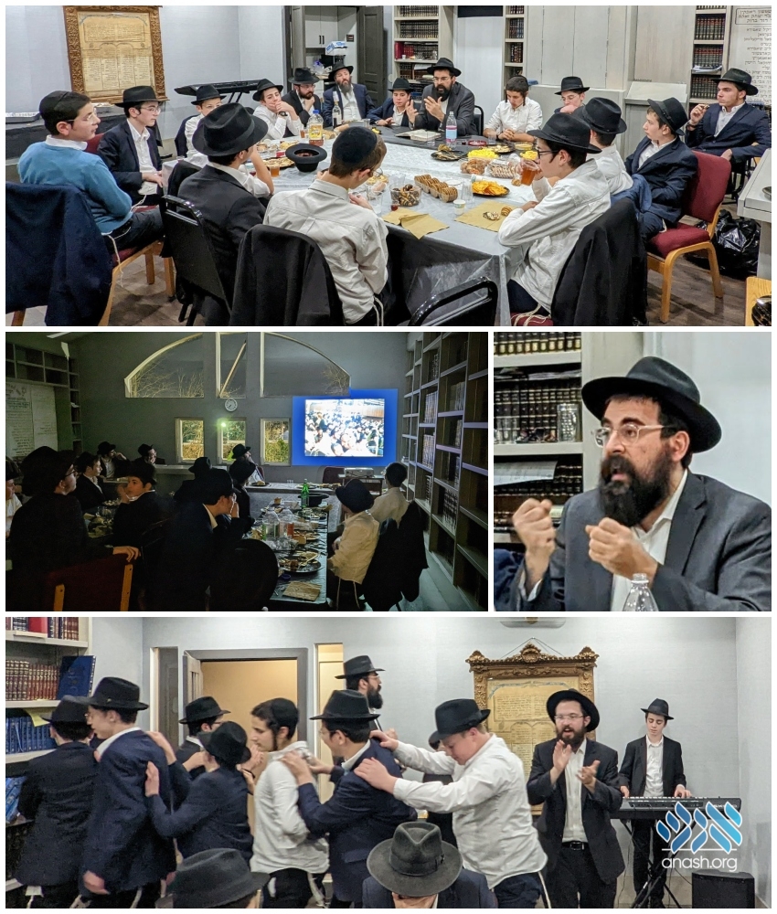The Talmidim were addressed by the Yeshiva’s Menahel Rabbi Mendy Kaminker, and Mashpia Rabbi Aaron Goldberg, and a special video was played showing clips of the Rebbe and glimpses into the scenes that took place during the first Rosh Chodesh Kislev, concluding with an address by the famed Dr. Ira Weiss.