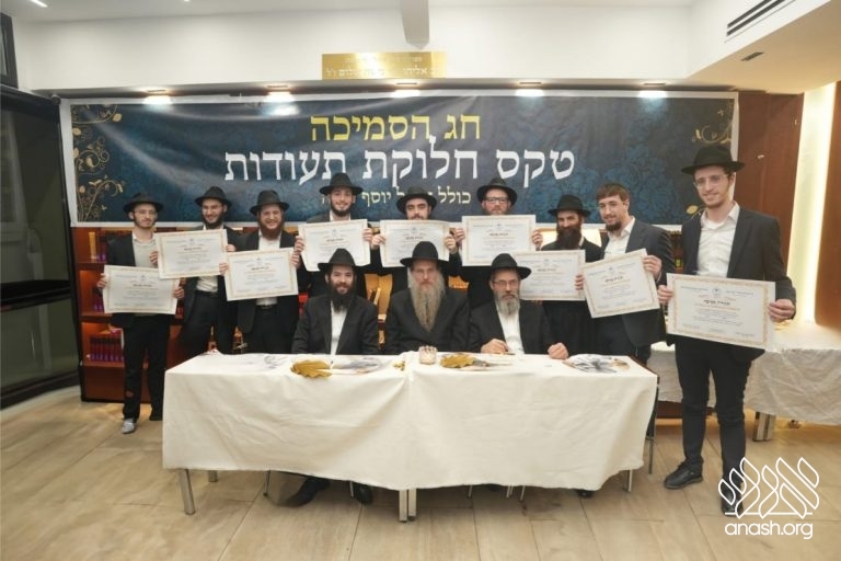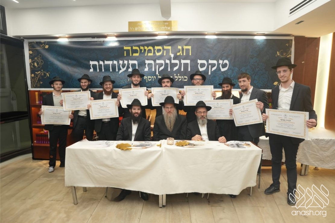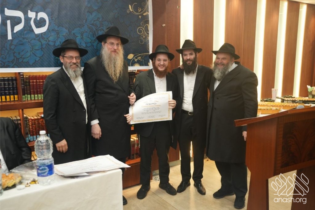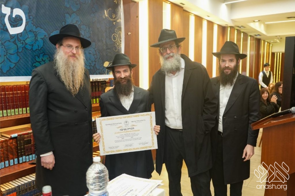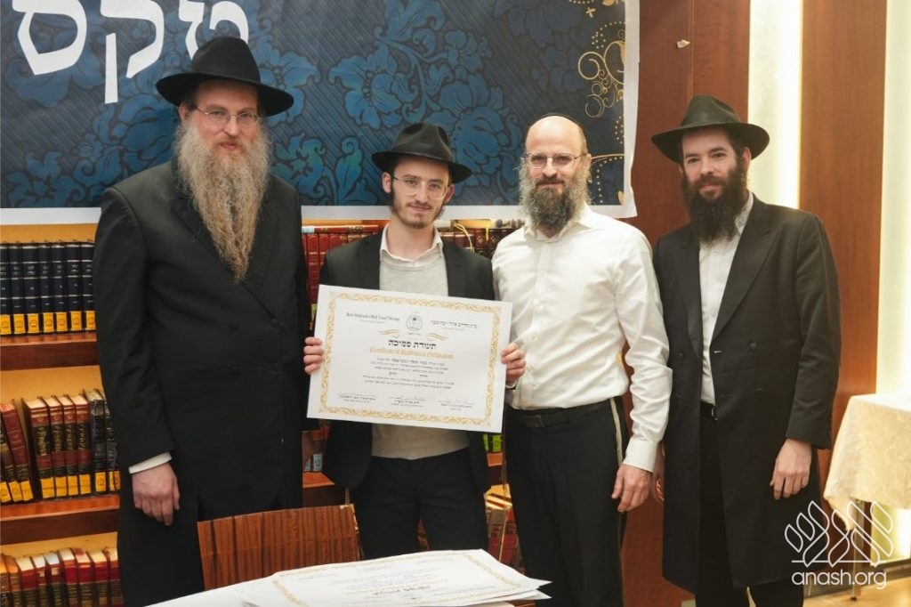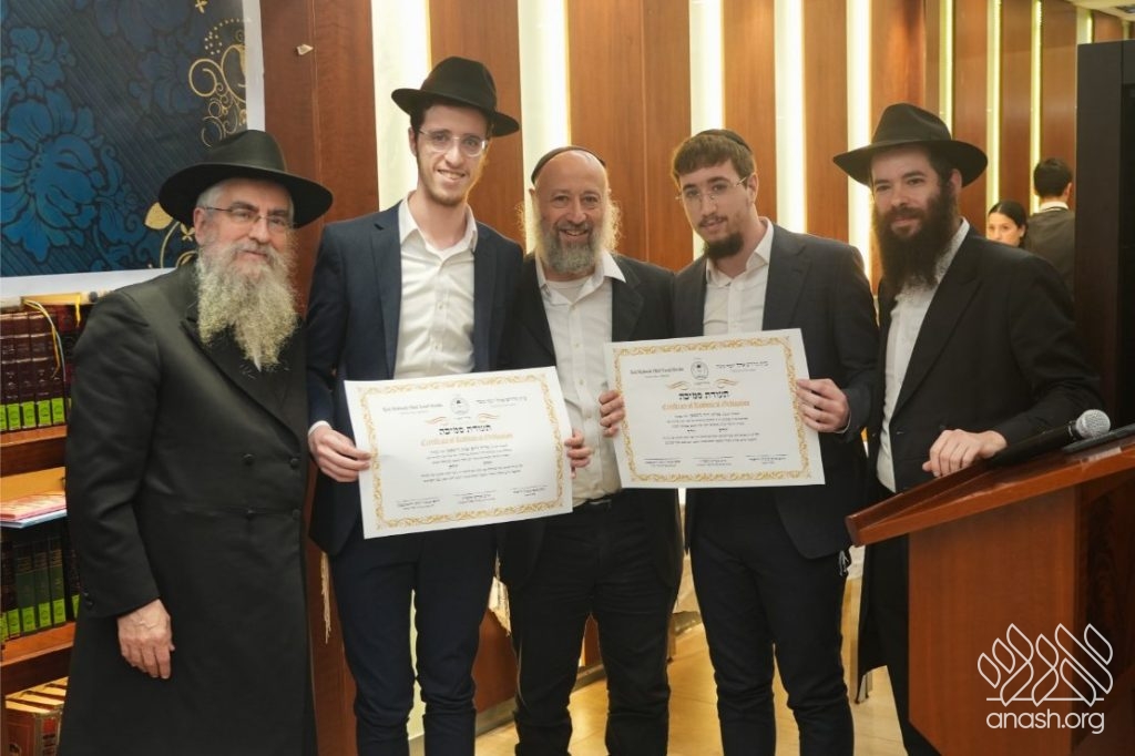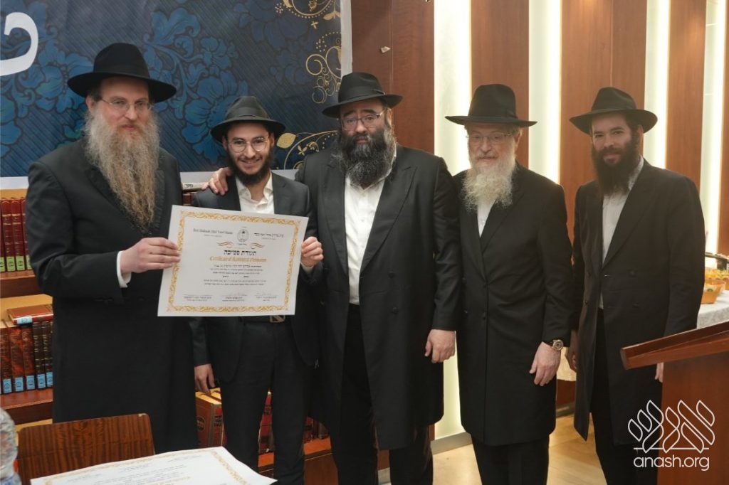 The Smicha graduates are Hatomim Avrohom Dovid Gorowitz, Dovid Posternak, Eliahu Steinberg, Mordejai Rosa, Eli and Ari Litman, Meir Moshe Zembrovsky, and Reb Nathan Goldwasser. A special recognition was given to Reb Itzjok Vodovosoff, who — despite being an adult and a working professional — devoted himself to Torah study with the dedication of a young bochur. He set aside every morning throughout the year to learn, successfully completing all the Semicha exams. His commitment stands as a true example to follow.