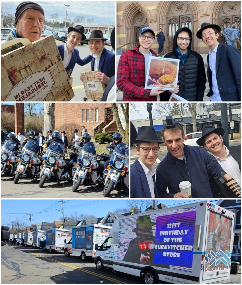 A dozen Mitzvah Tanks took to the street of New Haven, Connecticut to mark the Rebbe‘s 121st birthday on Yud Alef Nissan.