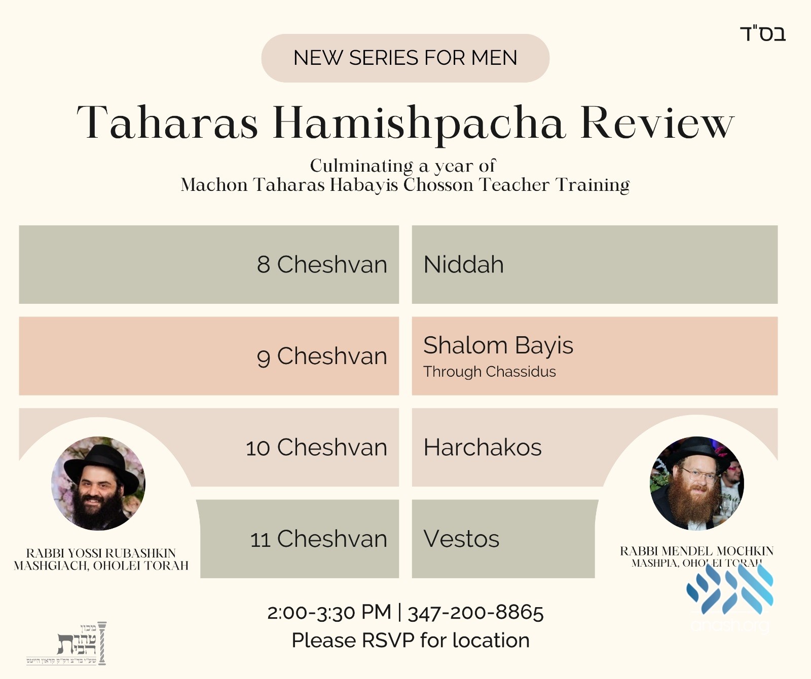 Machon Taharas Habayis is very excited to launch a series of Taharas Hamishpocha reviews in various locations and many different times to help the masses refresh these very special Halochos!