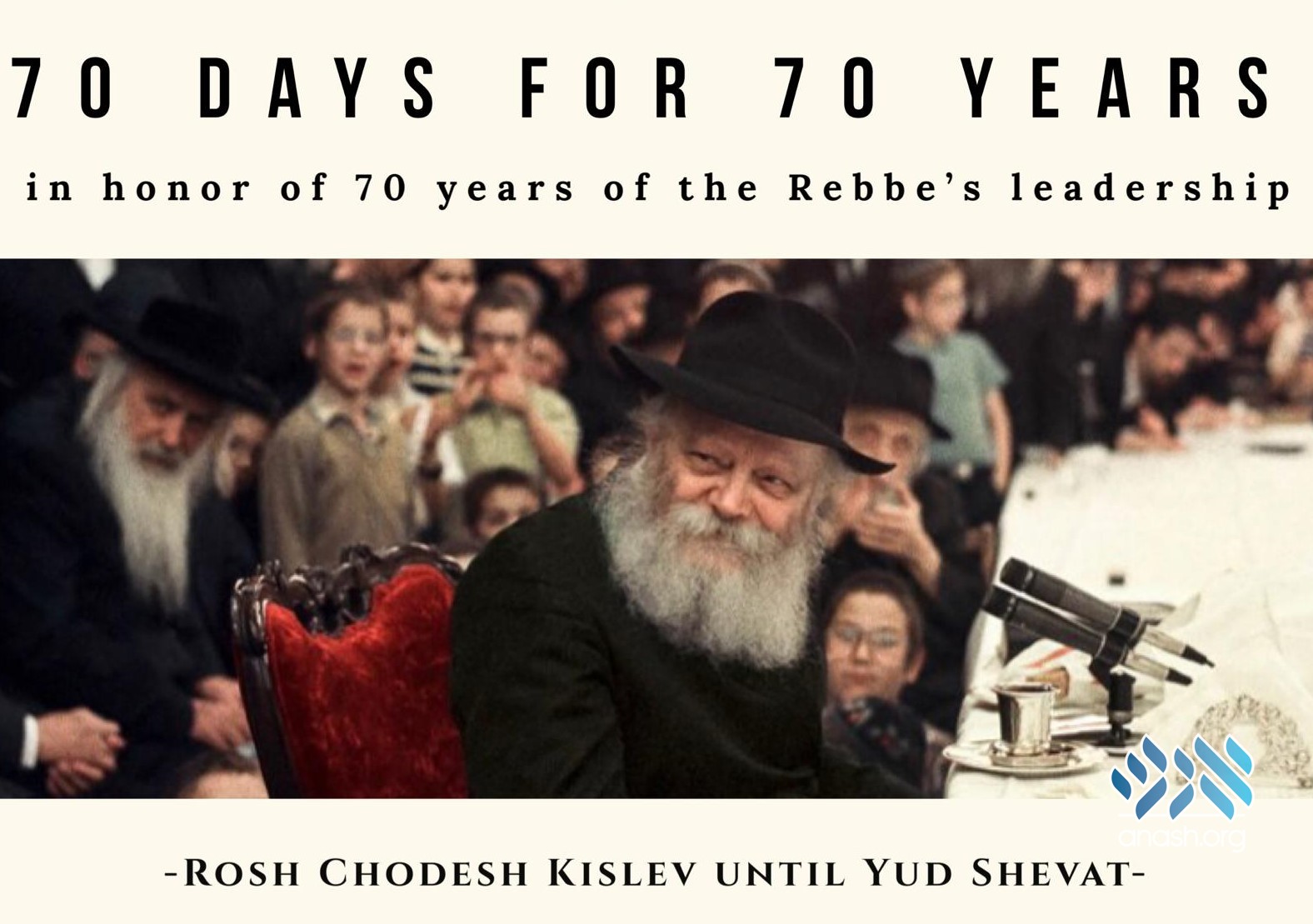 Proposed at the Shluchim Kinus by Rabbi Mendel Kaplan, and propelled into action by Rabbi Shmuel Serebryanski and Levi Jacobson, this campaign will launch a 70 day learning program between Rosh Chodesh Kislev and Yud Shevat, inviting all Anash to share a Moshiach thought with ten people daily, through classes, social media, or personal encounters.