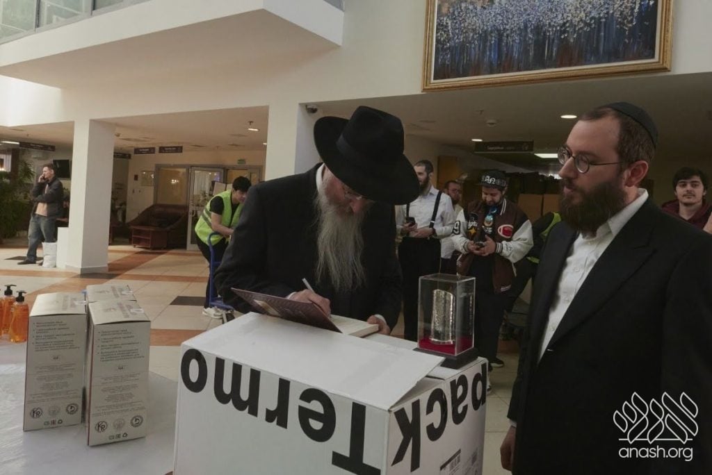 The Chief Rabbi himself visited the Shaarei Tzedek Jewish Chesed Center to personally oversee the operation. During his brief visit, he reviewed detailed data regarding the volume of orders, the number of individuals served, and personally inspected the quality of the products.