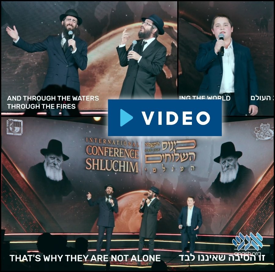 At the Kinus Hashluchim banquet, a powerful and stirring song inspired by Avraham’s example of “Lech Lecha” was sung by singers Shmuel and Eli Marcus together with young shliach from Aventura, Florida, Zalman Rosenfeld.