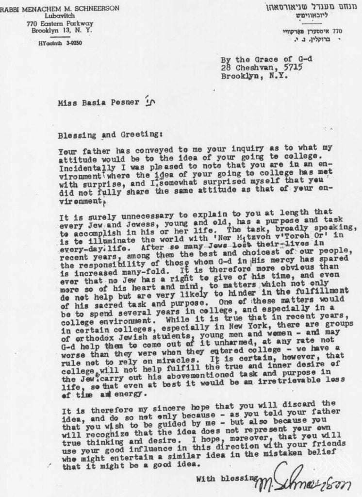 New Letters Shed Light on Rebbe’s Position on College