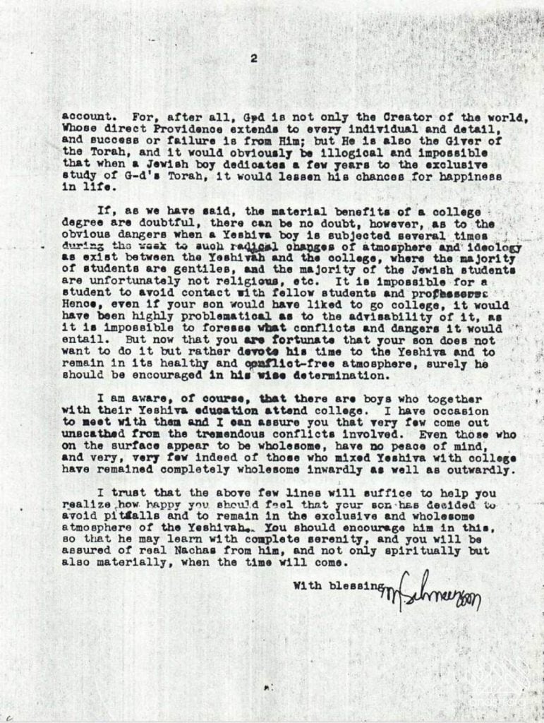 The Rebbe also challenges the common assumption that a degree is necessary to earn a livelihood, emphasizing that material benefits are not guaranteed while spiritual dangers are certain. Yeshiva study before entering the world, the Rebbe stresses, is a good investment: “G-d provides parnasah, and you will make a vessel for it when the time comes.”