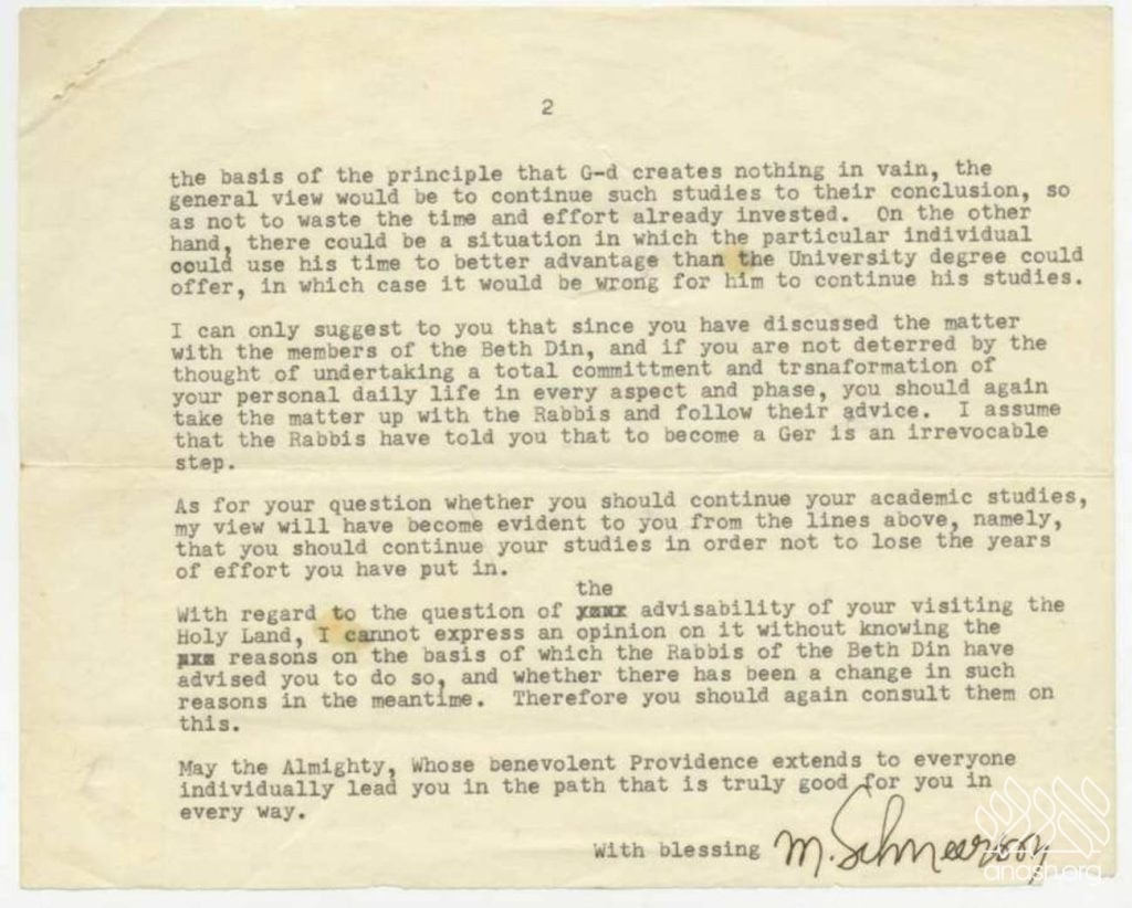 The second installment addresses individuals who had already begun their academic studies. In these letters, the Rebbe encourages completing college once it has been started, so that the time invested does not go to waste. In some cases, the Rebbe advises setting aside personal aspirations to finish a degree – for example, guiding a ba’al teshuva to finish qualifying as a lawyer – and even provided financial assistance in the form of scholarships.