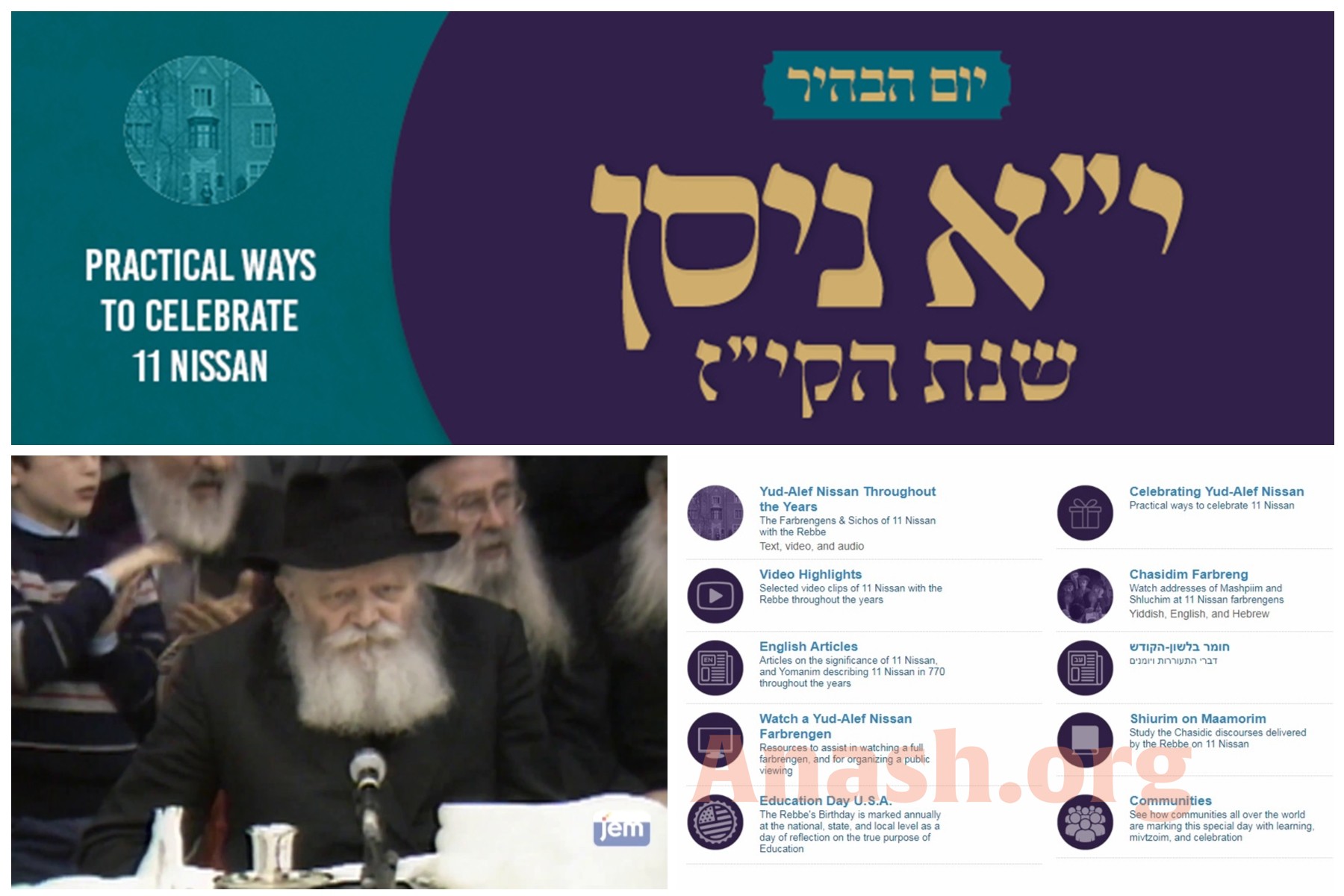 Users can experience a Yud Alef Nissan with the Rebbe by reading about, listening to, or watching clips of any year that the Rebbe publicly celebrated his birthday with the Chassidim.