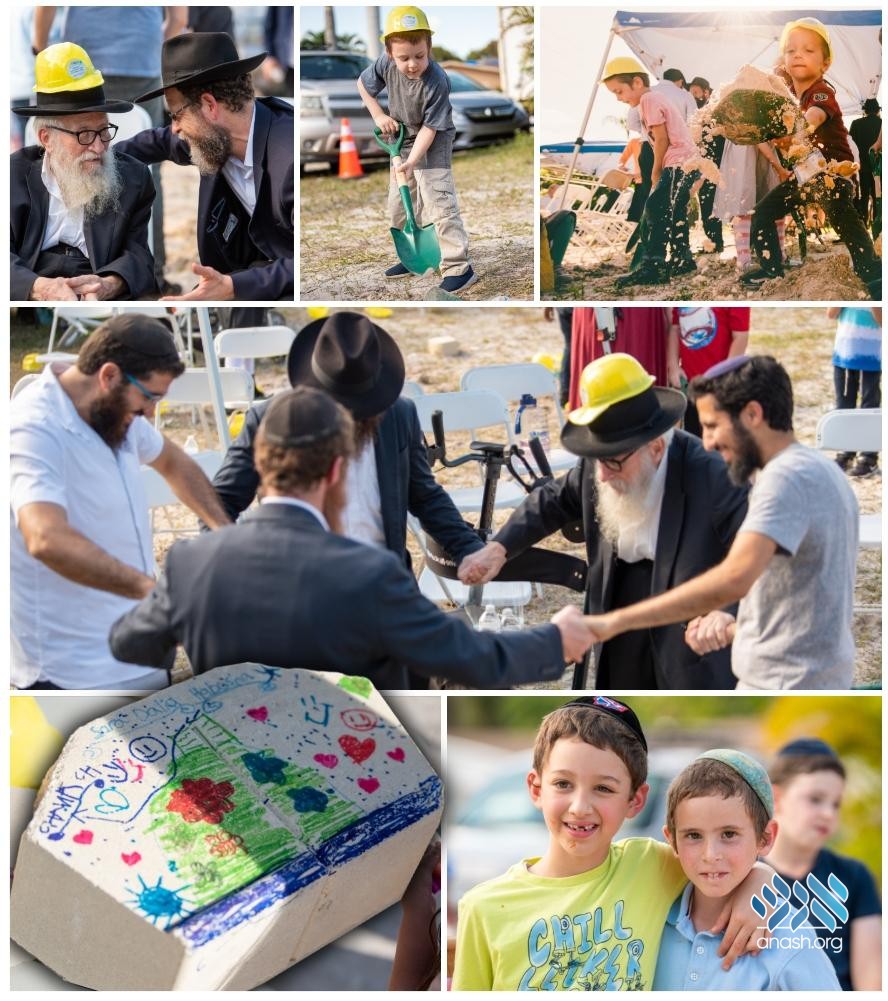 “Lets dig!” announced the kids as they grabbed the 50 shovels prepared to start construction. Who laid down the cornerstone? The children. Each family decorated a memorable “time capsule” cornerstone which the children set up on the grounds of the soon to be built Mikva.