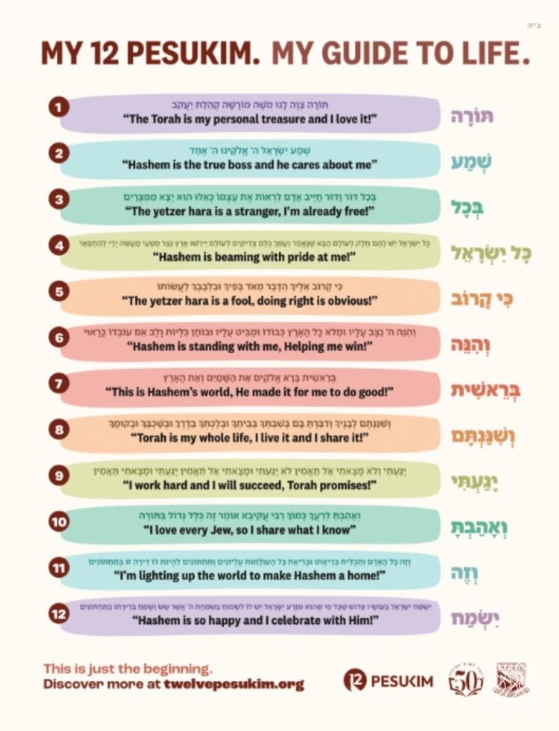 In honor of the 50th anniversary of the 12 Pesukim, Tzivos Hashem has released a new set of materials designed to help children and adults connect to the 12 Pesukim in a more personal, practical, and memorable way.