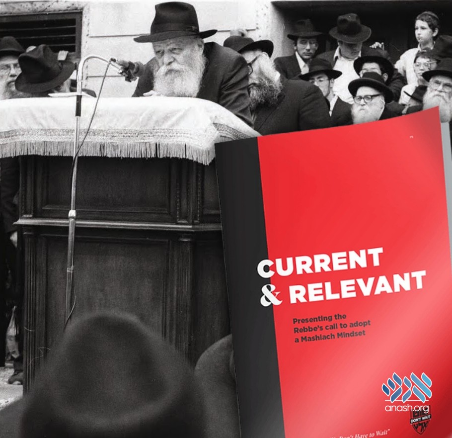 Enter the newest release from the Moshiach Office at Merkos 302 entitled “Current & Relevant: The Rebbe’s call to adopt a Moshiach Mindset.” This booklet introduces the new Tut Altz initiative, called ‘We Don’t Have to Wait,’ but also accomplishes way beyond that. It clarifies the multi-pronged approach of the Rebbe in regards to hastening the geulah, leaving the reader enlightened and empowered to do so.
