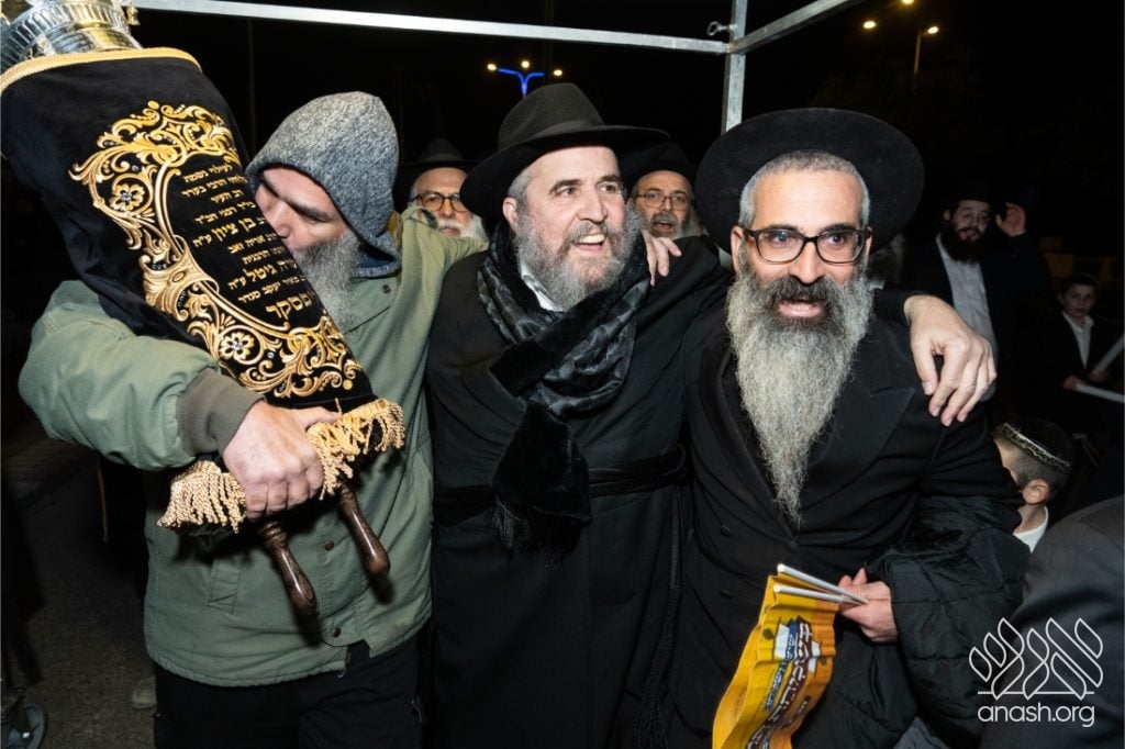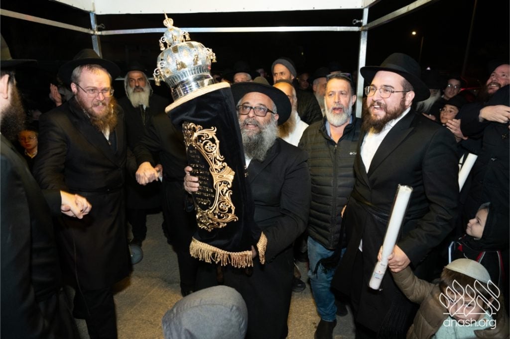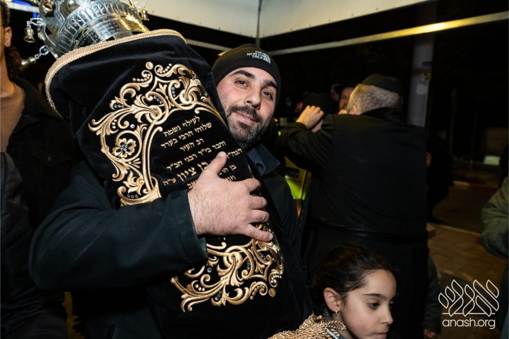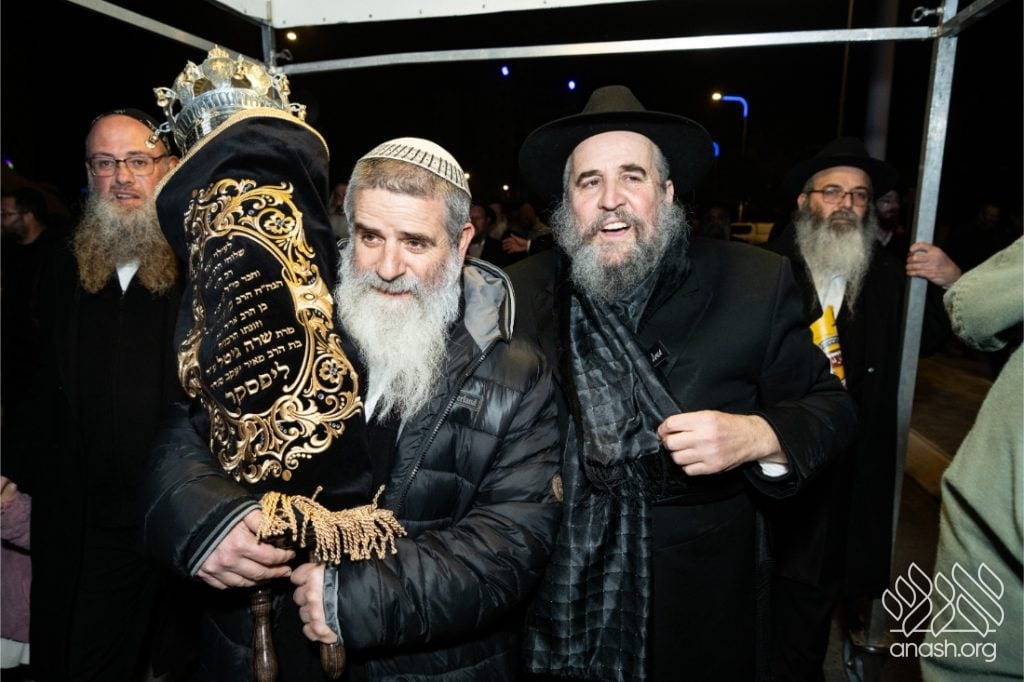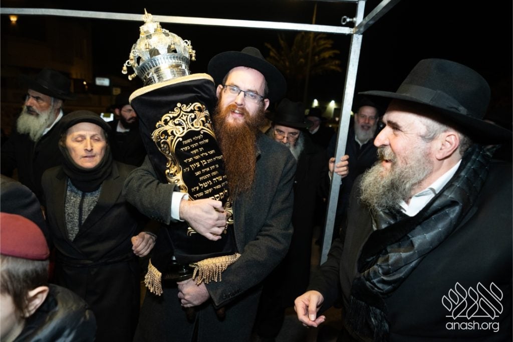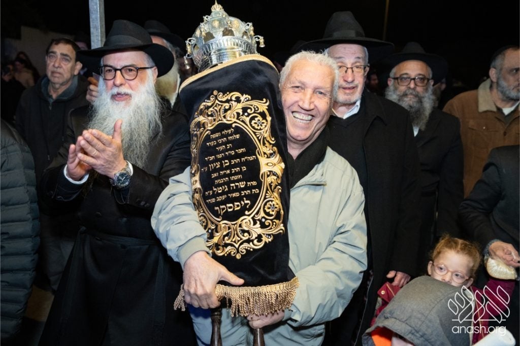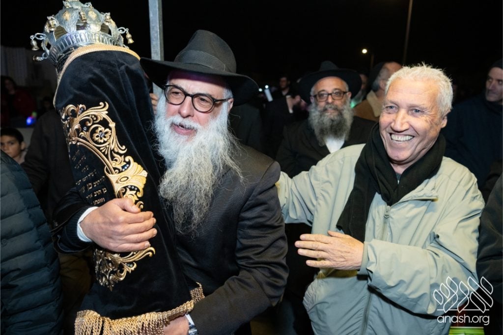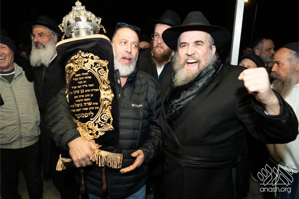 Hundreds of city residents and bochurim from Kiryat Gat and other yeshivos accompanied the sefer Torah in an impressive procession with joyous singing and dancing to the Anash shul. The procession was skillfully led by shliach Rabbi Nochum Goldschmid.