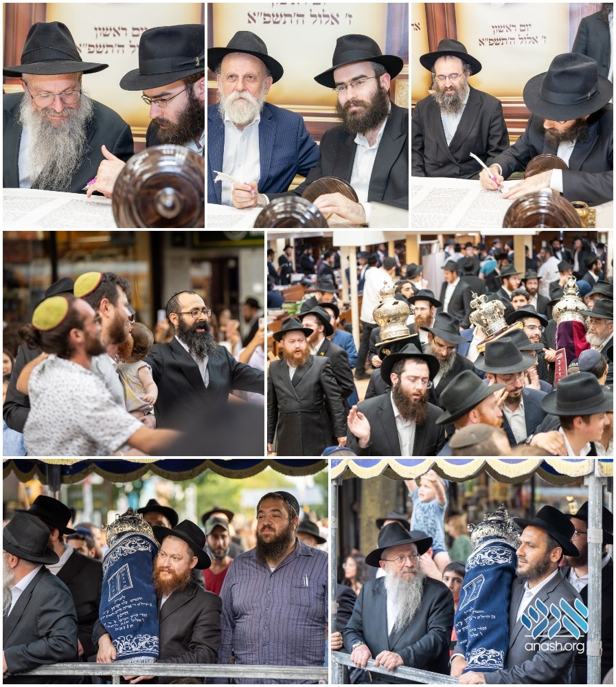Writing of the final letters was followed by a parade with music towards 770 Eastern Parkway for dancing and hakafos.