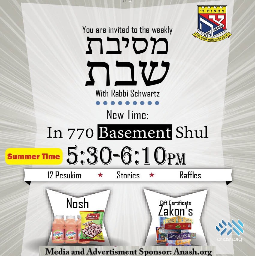 The Messibas Shabbos takes place weekly in the basement shul at 770 before Mincha. In the summer, the weekly gathering takes place from 5:30-6:10 PM.