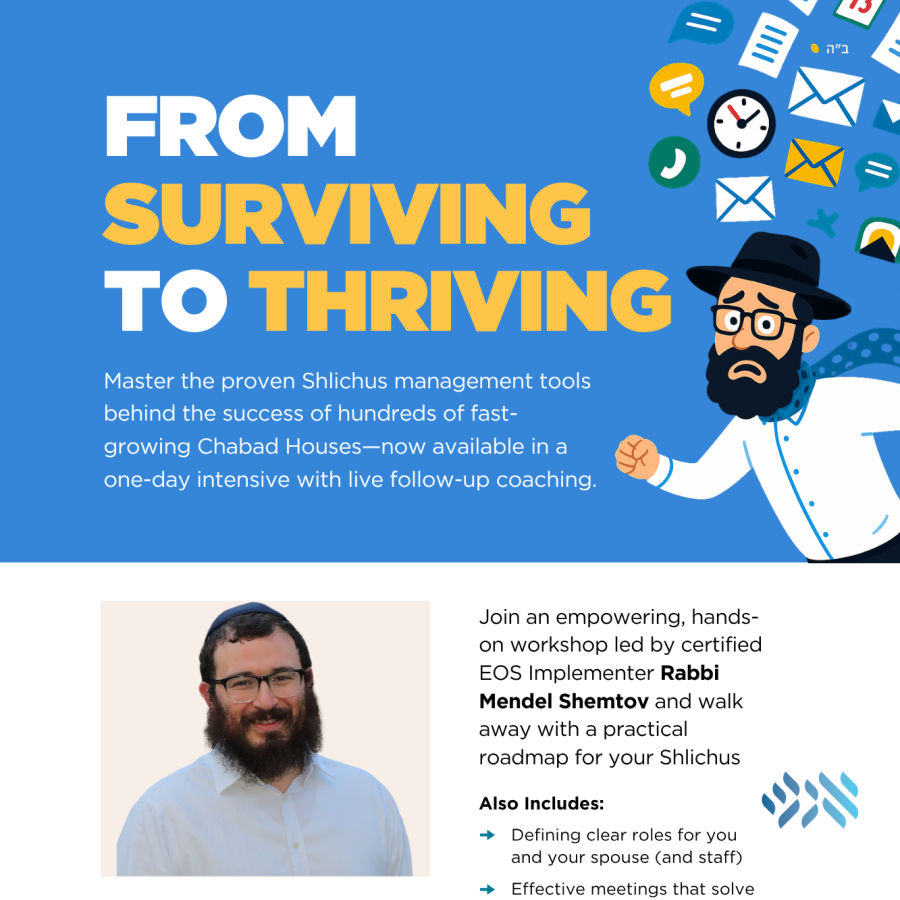 The workshop will be led by Rabbi Mendel Shemtov, a professional EOS Implementer who has worked closely with Shluchim and mosdos worldwide. With a background in business strategy and a deep understanding of the realities of Shlichus, Rabbi Shemtov brings a grounded and highly practical approach.