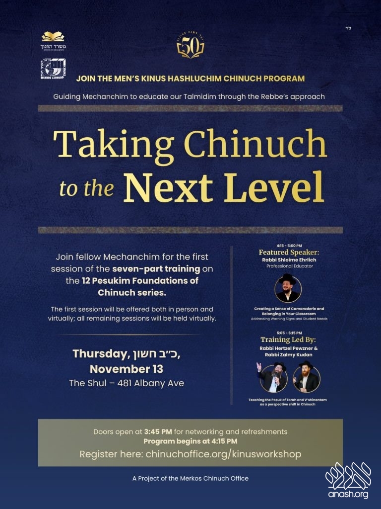 On Thursday, 22 Cheshvan (November 13), educators will gather, both in person and virtually, for the first of seven empowering training sessions, led by Rabbi Hershel Pewzner and Rabbi Zalmy Kudan, who bring a wealth of experience and passion for chinuch to every session. Together, they’ll discover the depth of the Rebbe’s Chinuch language as illuminated by the 12 Pesukim.