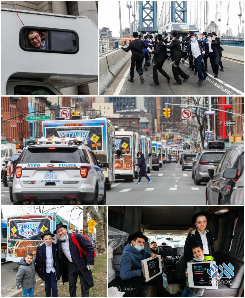 Both sets of tanks spread out throughout NYC, offering passerby a chance to put on tefillin, and reminding them about the upcoming Yom Tov of Pesach. The “tankistim” handed out thousands of shmura matza packets and laid Tefillin on hundreds, who warmly thanked them for the opportunity.