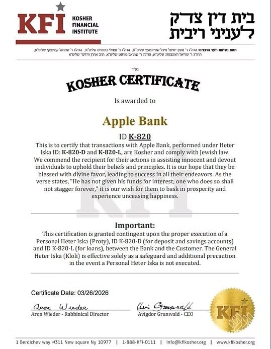 “This is to certify that transactions with Apple Bank are Kosher and comply with Jewish law,” the official certification reads. “We commend the recipient for their actions in assisting innocent and devout individuals to uphold their beliefs and principles.”