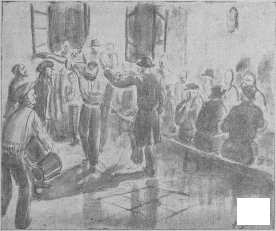 The sketch depicts the widespread minhag of pouring water on the floor and dancing across it, reminiscent of keriyas yam suf. Many Chabad communities practices this minhag, and some communities in Eretz Yisroel still do it today.