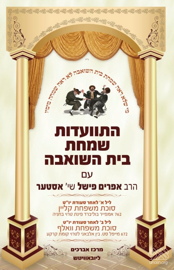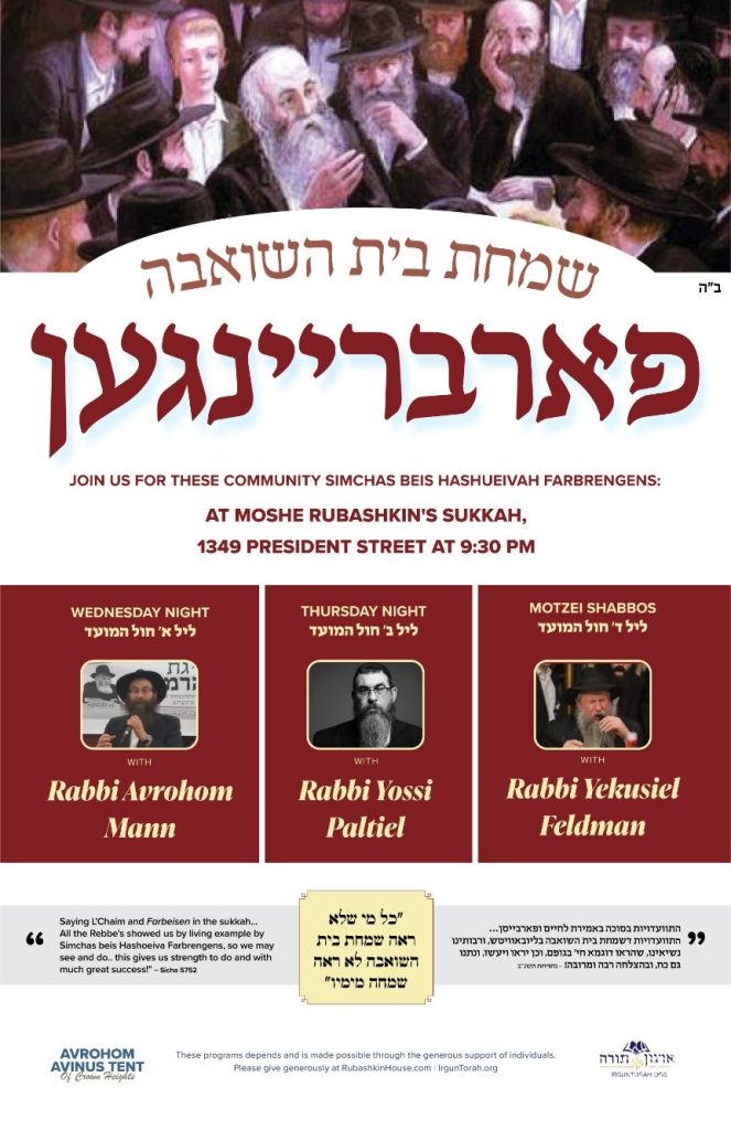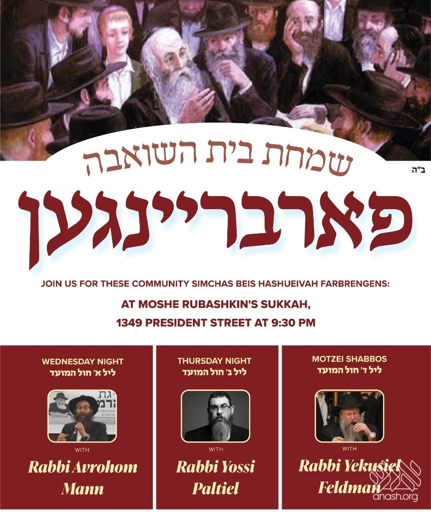 On the nights of Yom Tov, Rabbi Fishel Oster will farbreng. On the first night, in the Klyne sukkah at 762 Empire Blvd, and on the second night, at the Wolf sukkah at 672 Maple St.