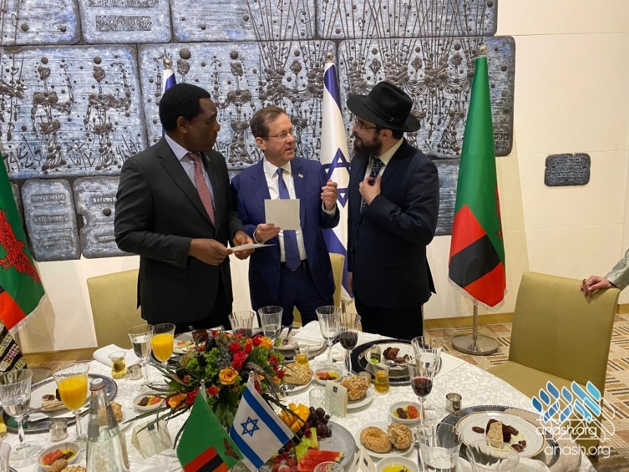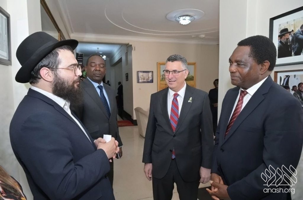 Zambia is a majority-Christian country, and Rabbi Hertzl says the community has encountered nothing but warmth — support for Jews, for Eretz Yisroel, and genuine curiosity about Judaism. Emails arrive daily from non-Jews asking about the Sheva Mitzvos, about conversion, about whether non-Jews have a share in the World to Come. In 2023, the Hertzls met Zambian President Hakainde Hichilema in Eretz Yisroel and presented him with a menorah.