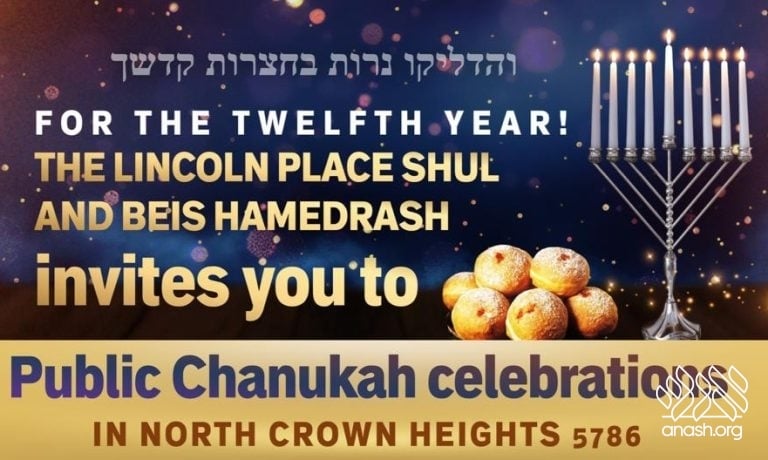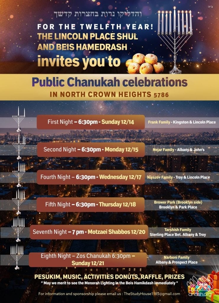 The Lincoln Place Shul is inviting the entire Crown Heights community to nightly public menorah lightings that will be held in North Crown Heights on seven nights of Chanukah.