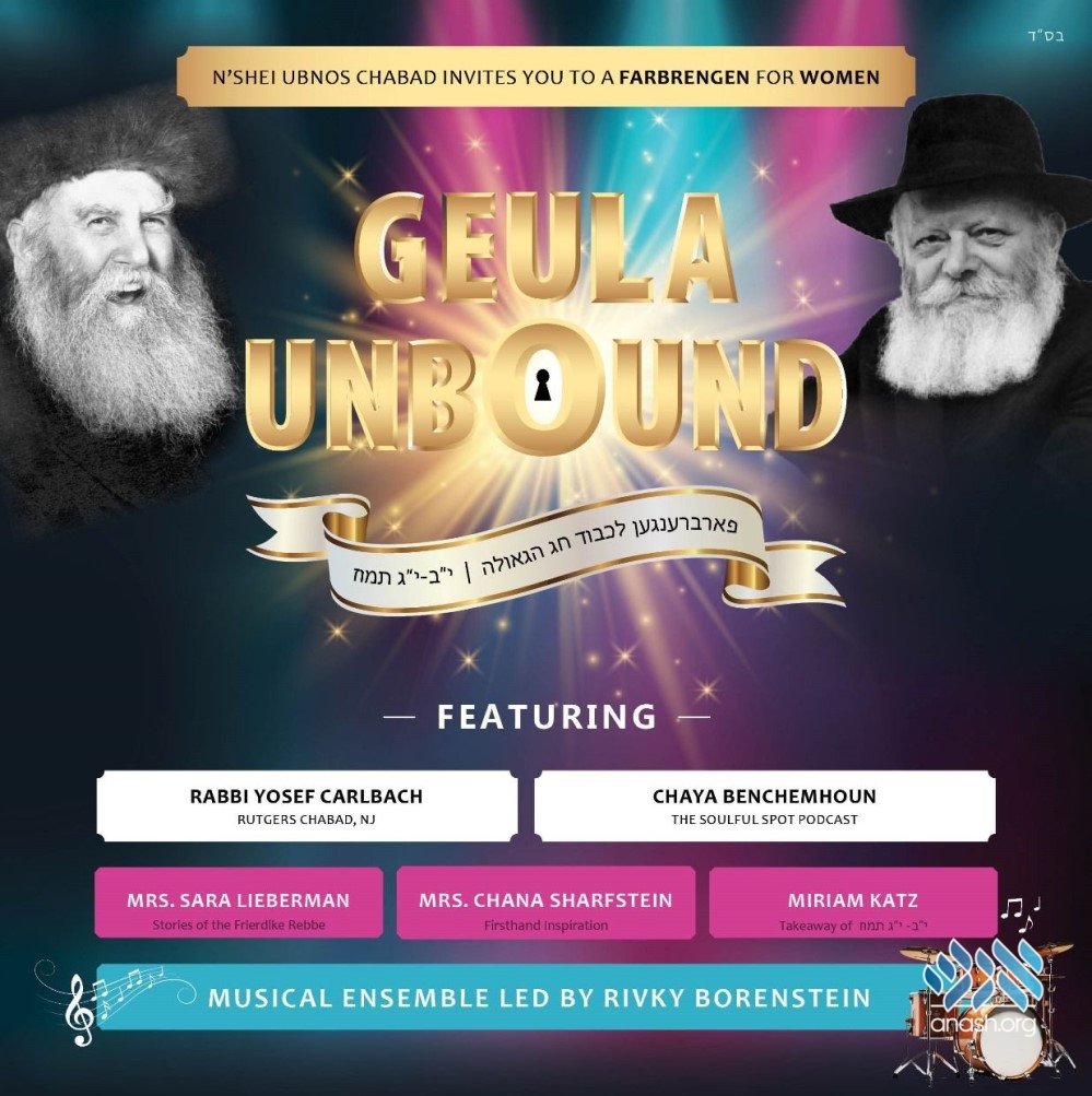 N’shei Chabad of Crown Heights invites women and girls of all ages to an uplifting and powerful Yud Beis–Yud Gimmel Tammuz farbrengen, titled “Geulah Unbound”, taking place on Tuesday at the beautiful Anshei Lubavitch Hall, 578 Albany Avenue.